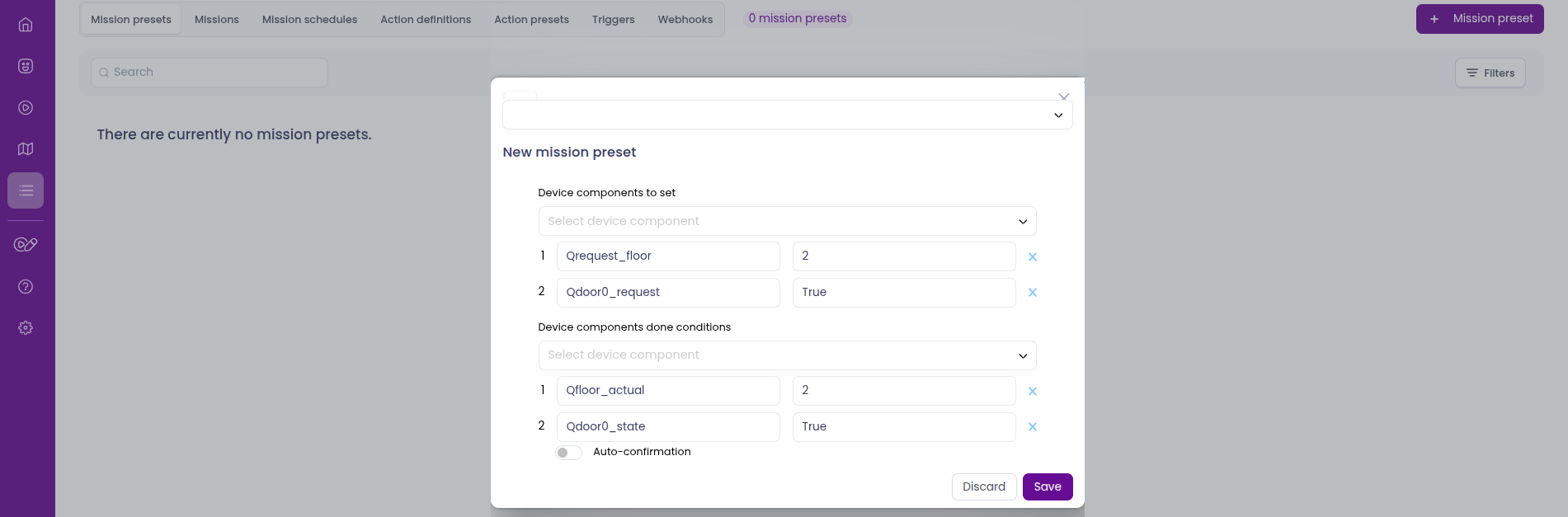 The image below shows a sample mission preset that sends the elevator to Floor 2 and opens Door 0.