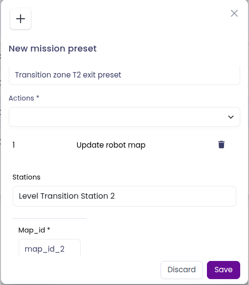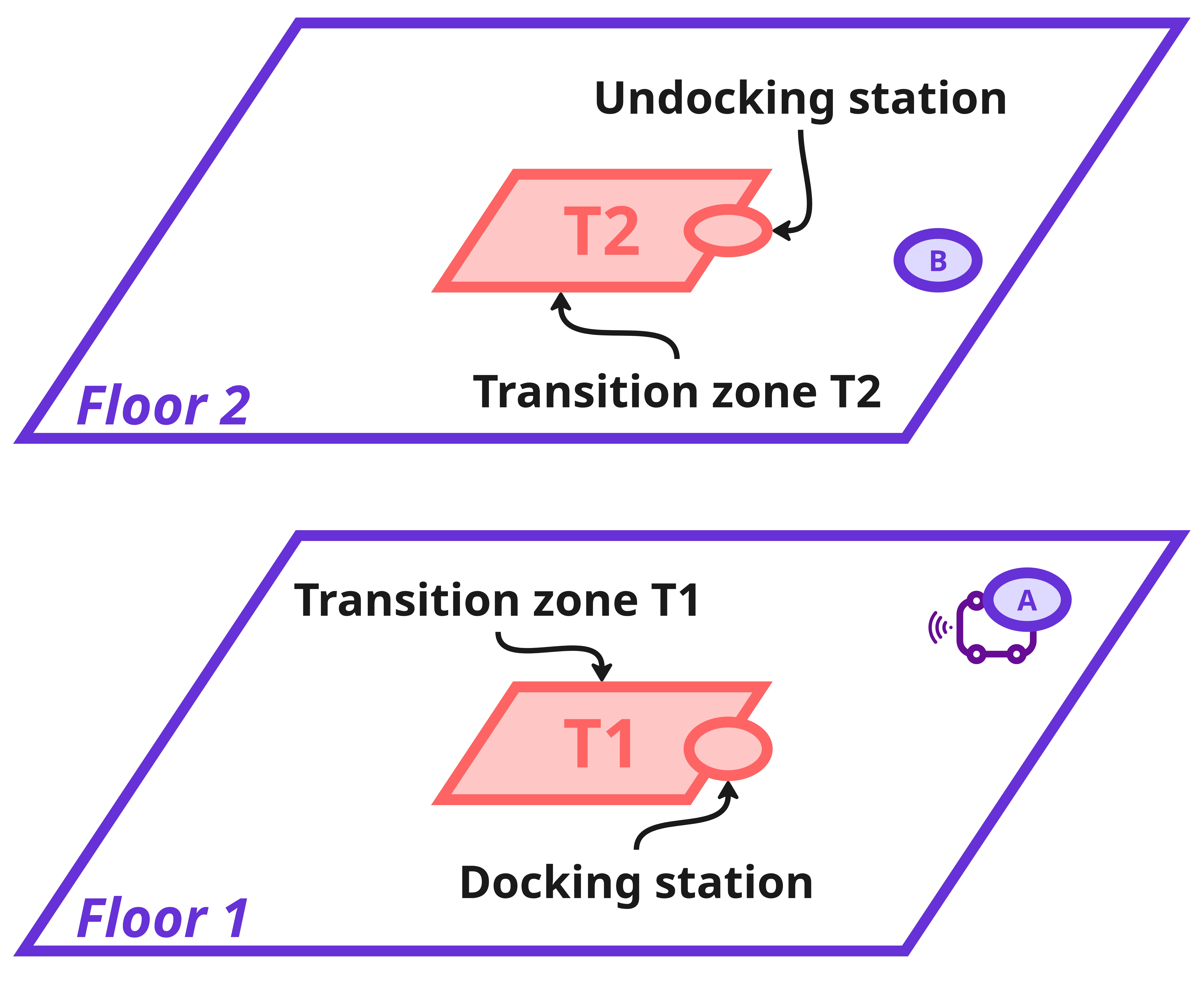 Transition Zones allow users to define Entry and Exit Presets for each zone. These presets determine the robot’s behavior, such as docking/undocking, calling an elevator, or sending custom messages to elevators or other devices.