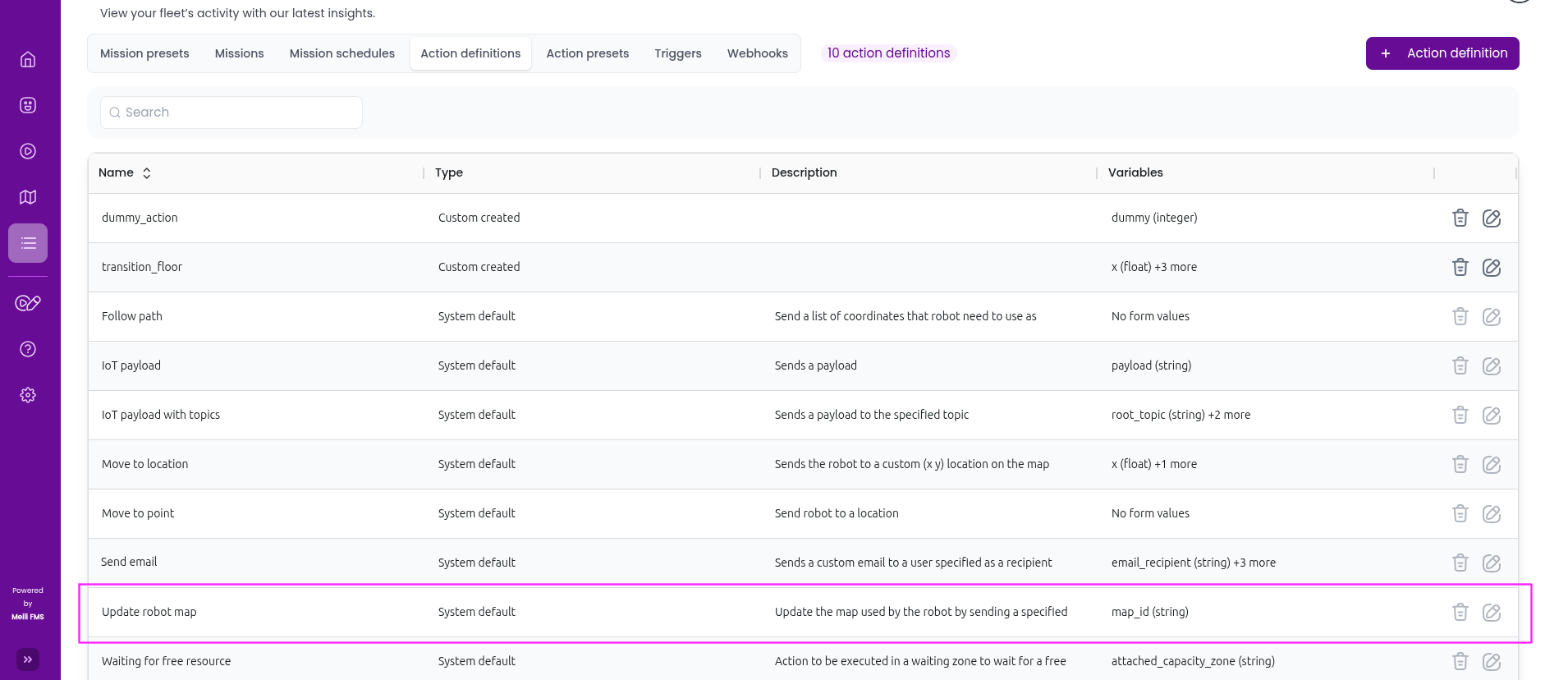 The Update Robot Map action is a default system action. It can be replaced with a user-defined action if the robot does not support the standard format. Triggering this action performs the following: