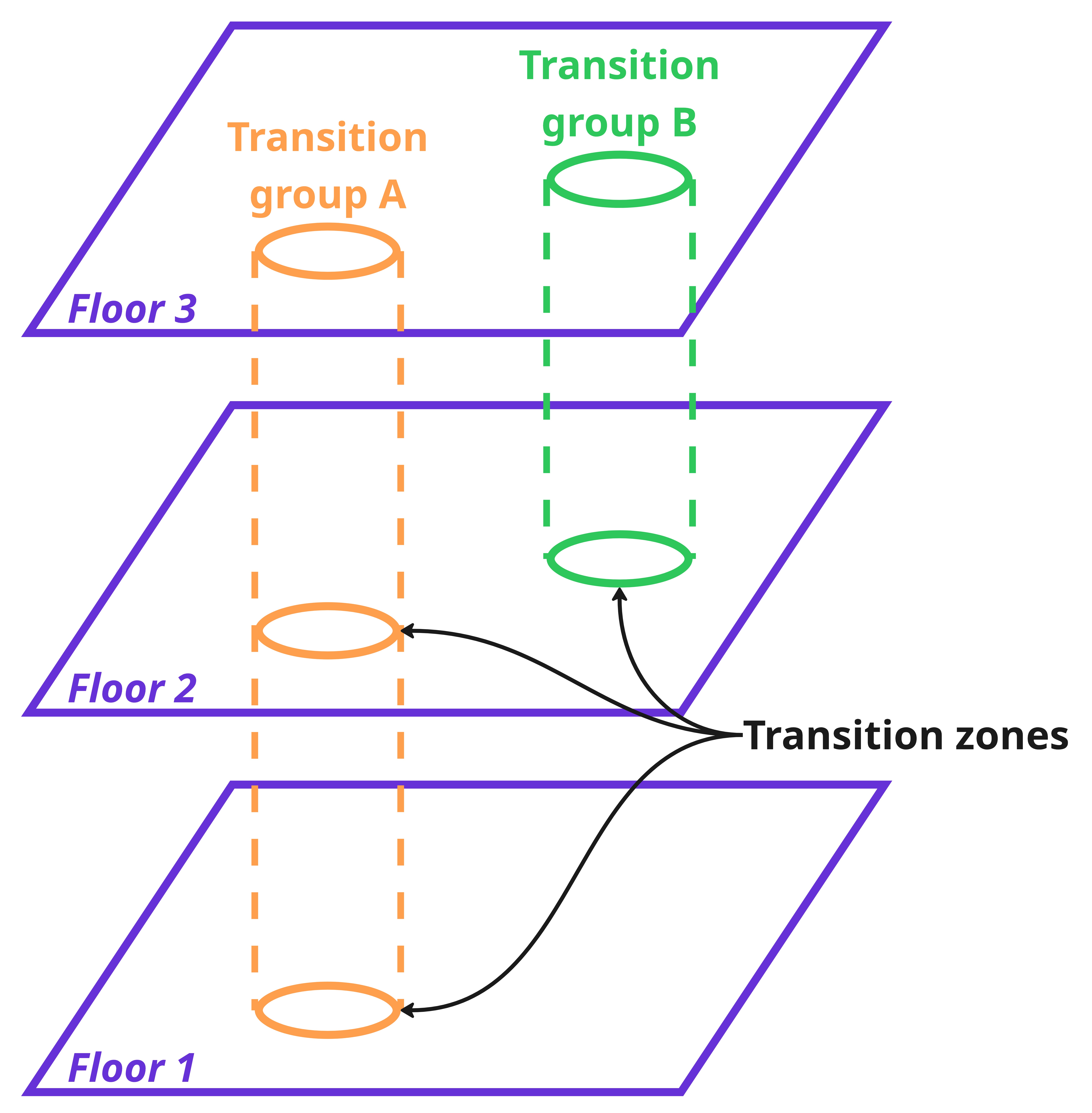 To ensure accurate floor transitions — especially when multiple elevators are present — each transition zone must belong to a Level Transition Group.